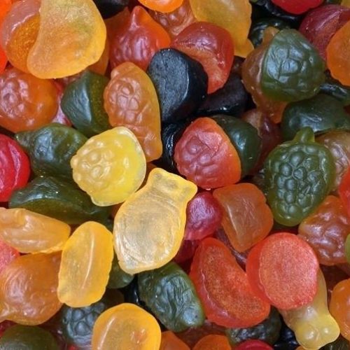 Glucose syrup, Sugar, Water, Beef Gelatine, Modified Potato starch, Liquorice extract, Colours (Anthocyanins, Carmines, Chlorophylls, Curcumin, Lutein, Paprika extract, Mixed Carotenes, Vegetable Carbon), Maize starch, Modified Tapioca starch, Fruit Juice Concentrates (Apple, Blackcurrant, Grapefruit, Lemon, Lime, Orange, Pear, Raspberry, Strawberry), Vegetable oils (Palm oil, Coconut oils), Aniseed oil, Acids (Acetic acid, Citric acid, Fumaric acid, Lactic acid, Malic acid), Apple Jam [Glucose-Fructose Syrup, Sugar, Concentrated Apple Puree, Water, Apple Juice, Acidity Regulator (Sodium Citrate), Acid (Citric Acid)], Gelling agent (Pectin), Acidity regulator (Sodium bicarbonate), Glazing agent (Carnauba wax, Beeswax, Gum Arabic), Plant Concentrates (Safflower, Spirulina).