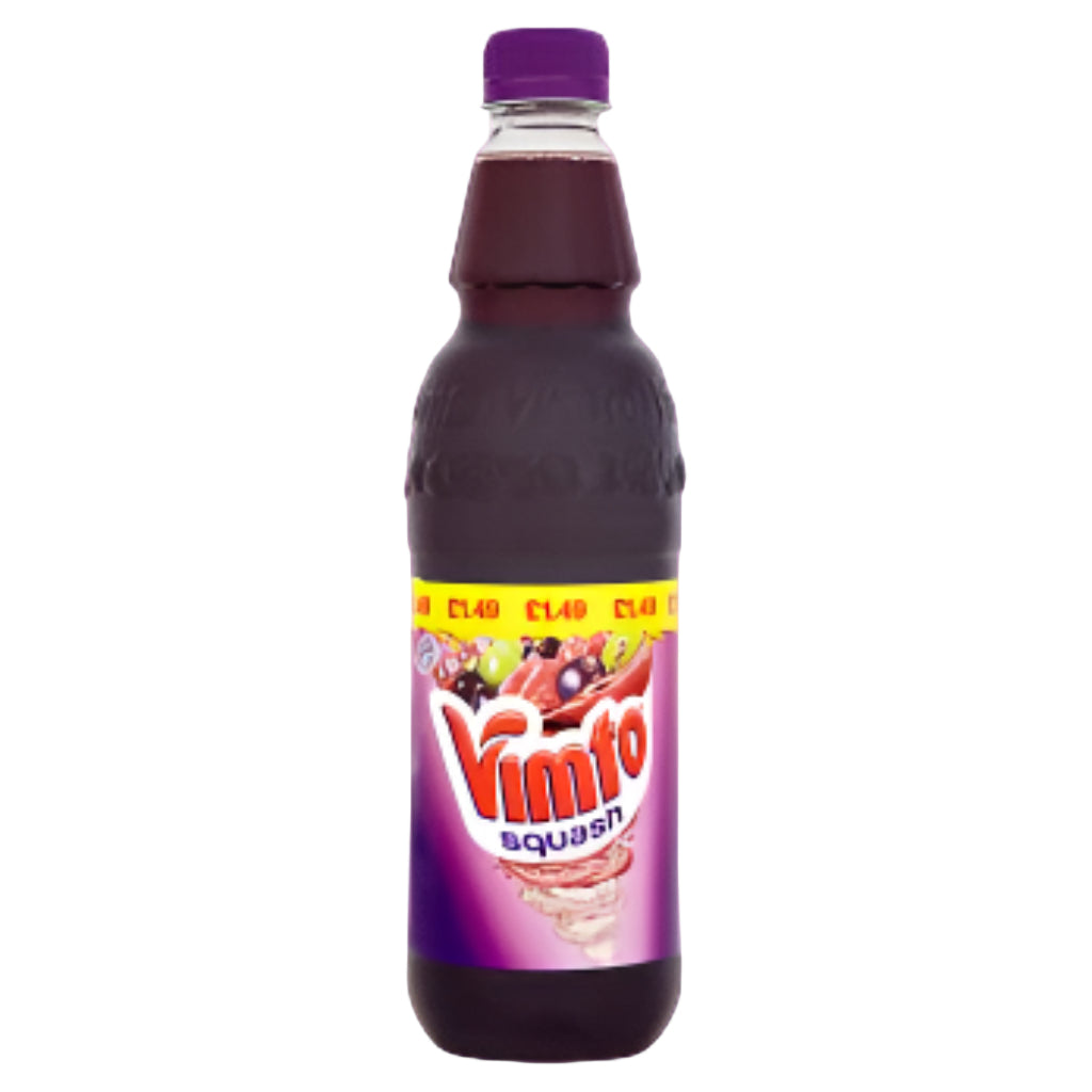 Water, Sugar, Mixed Fruit Juices from Concentrate 10% (Grape, Blackcurrant, Raspberry), Acid (Citric Acid), Vimto Flavouring (including Natural Extracts of Fruits, Herbs, Barley Malt and Spices), Colouring Food (Concentrates of Carrot, Hibiscus), Acidity Regulator (Sodium Citrate), Preservatives (Sodium Benzoate, Potassium Sorbate), Vitamin C, Sweeteners (Sucralose, Acesulfame K).